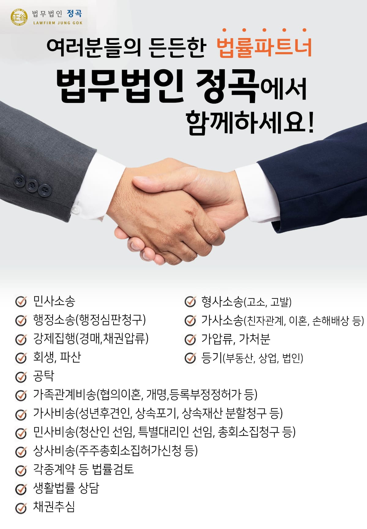 법무법인 정곡은 고객의 법적 문제를 면밀히 분석하고, 풍부한 경험과 전문성을 바탕으로 최적의 해결책을 제공합니다. 철저한 법률 검토와 전략적 접근을 통해 의뢰인의 권익을 최우선으로 보호하며, 모든 상담은 무료로 진행되므로 언제든지 부담 없이 문의해 주시기 바랍니다!